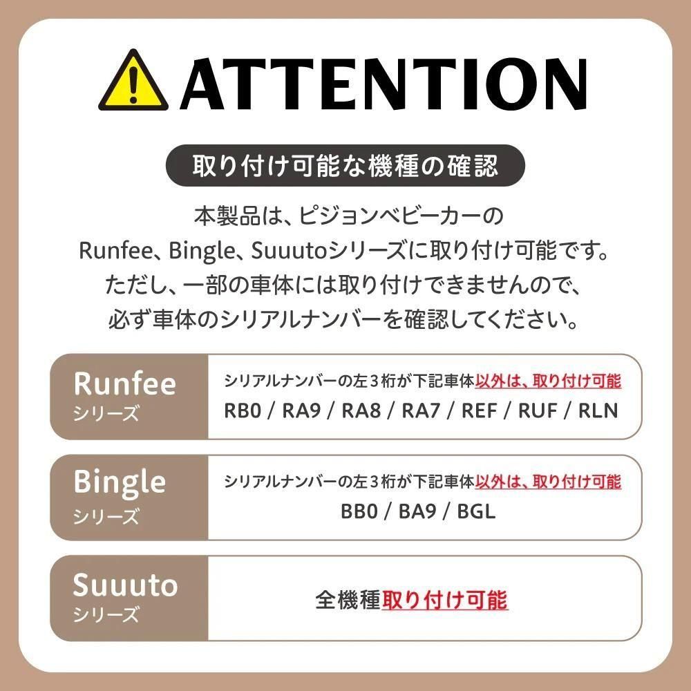 本製品は、ピジョンベビーカーのRunfee、Bingle、Suuutoシリーズに取り付け可能です。ただし、一部の車体には取り付けできませんので、必ず車体のシリアルナンバーを確認してください。